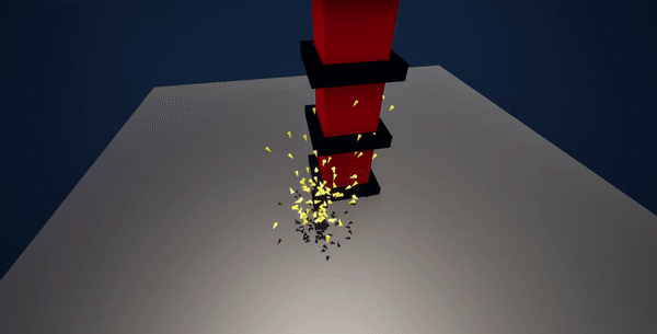 I also wanted the swarms to travel between different target locations and handle avoiding obstacles. After a certain amount of time, I move the target to a new location and send the boids on their way. They need to use a similar calculation to the one above to find a direction that doesn’t result in a collision for them. The difference here is that they can stop calculating once they’ve found a valid direction. This gives us the behavior below, where we see the boids flying around the tower in the center to get to their desired location.