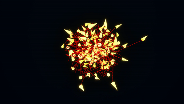 To start, I spawn a number of boids (in this case 150) in the scene and give them nothing more than the standard forces of alignment, cohesion, separation, avoidance and target seeking to create their emergent behavior. A target is placed somewhere randomly, and they immediately enter the first phase of the swarm as they seek their target. The movement during this phase happens in a loose cloud formation as each of them beelines towards the center of the target. Once they arrive, however, they enter a second phase of the swarm in which they form a busy cluster around their target.